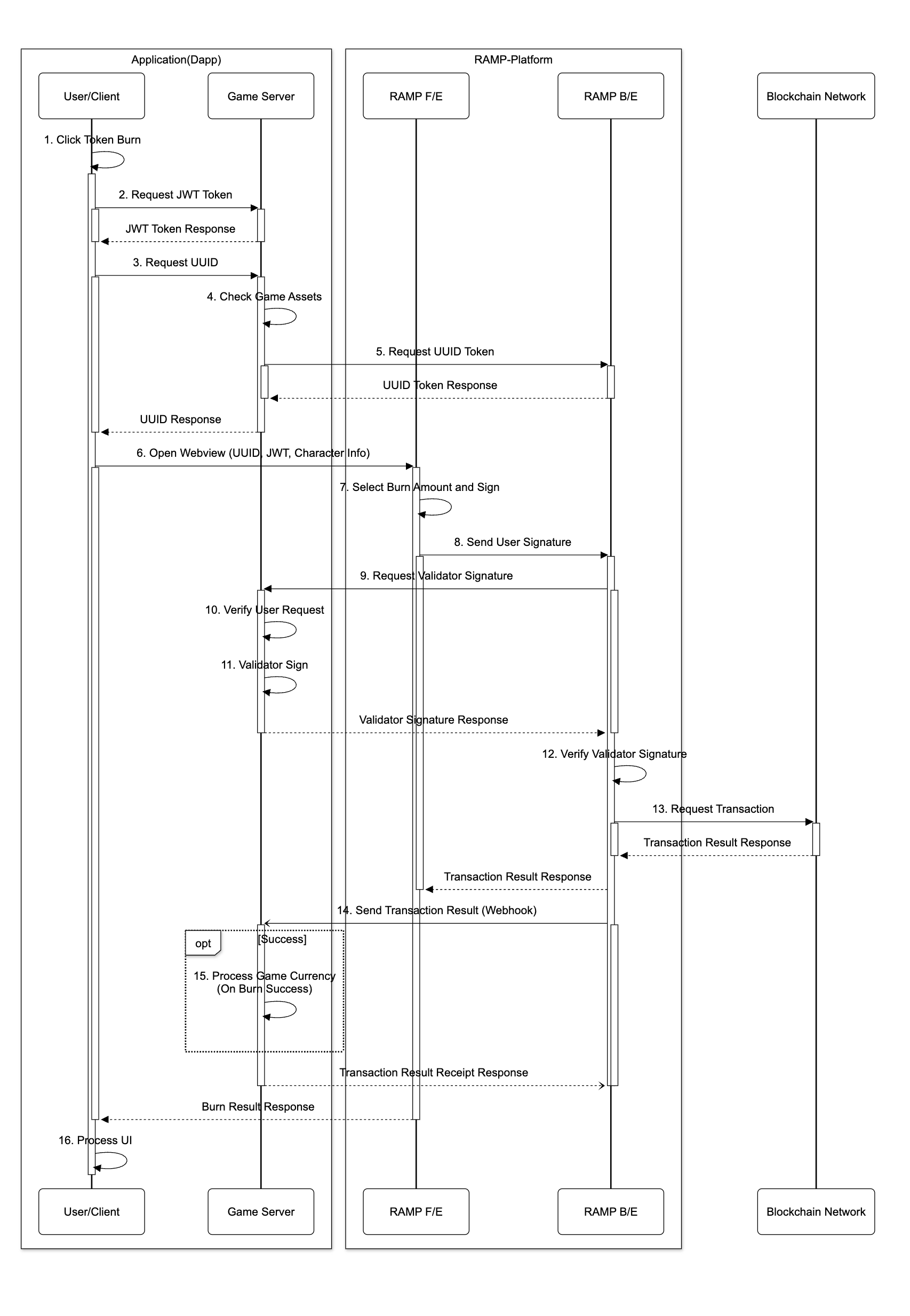 If the transaction fails, game assets should not be granted. - In sequence 10, it is necessary to verify whether the game assets and token amounts used for user token burning match the game assets and token amounts requested by the CROSS platform.