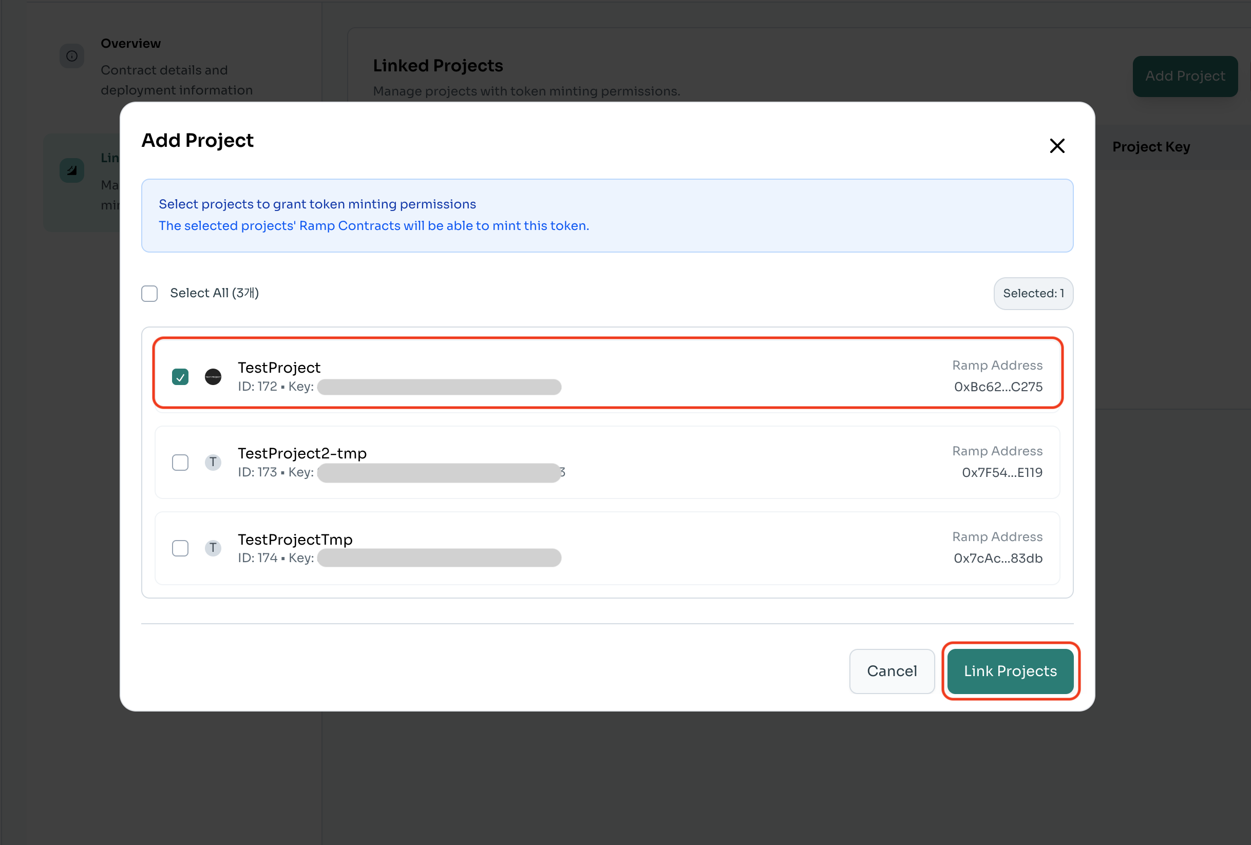 After selecting the project to link, click the 'Link Projects' button and proceed with the admin wallet signature.
