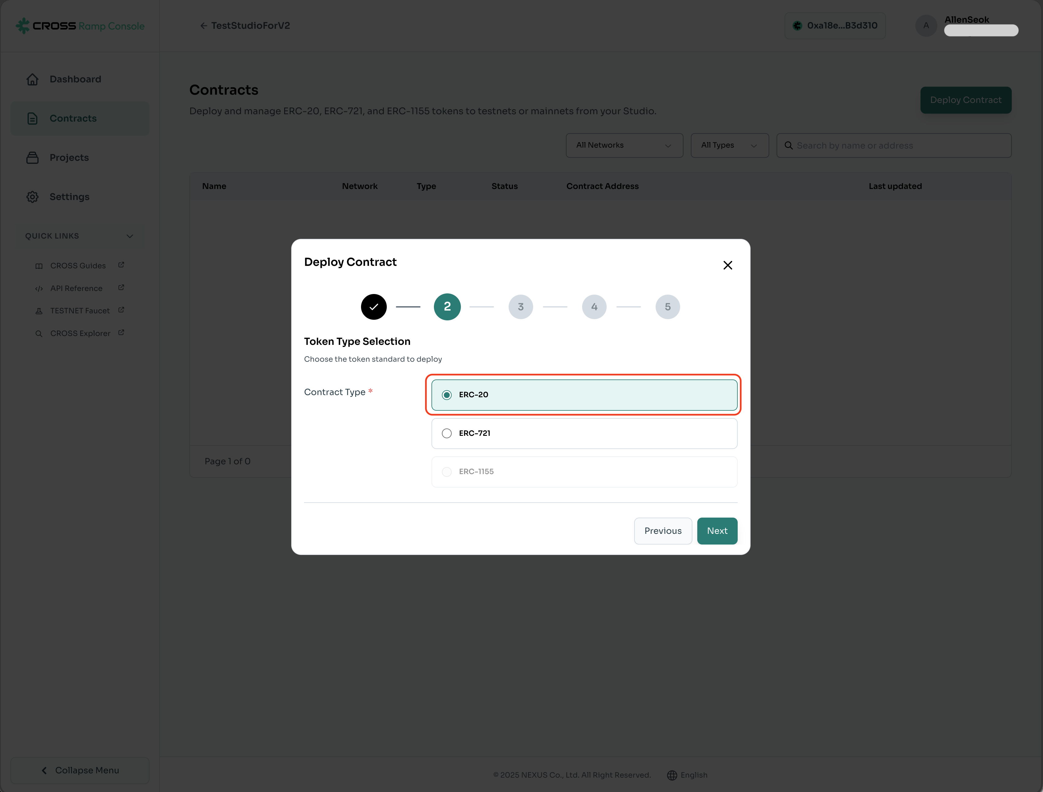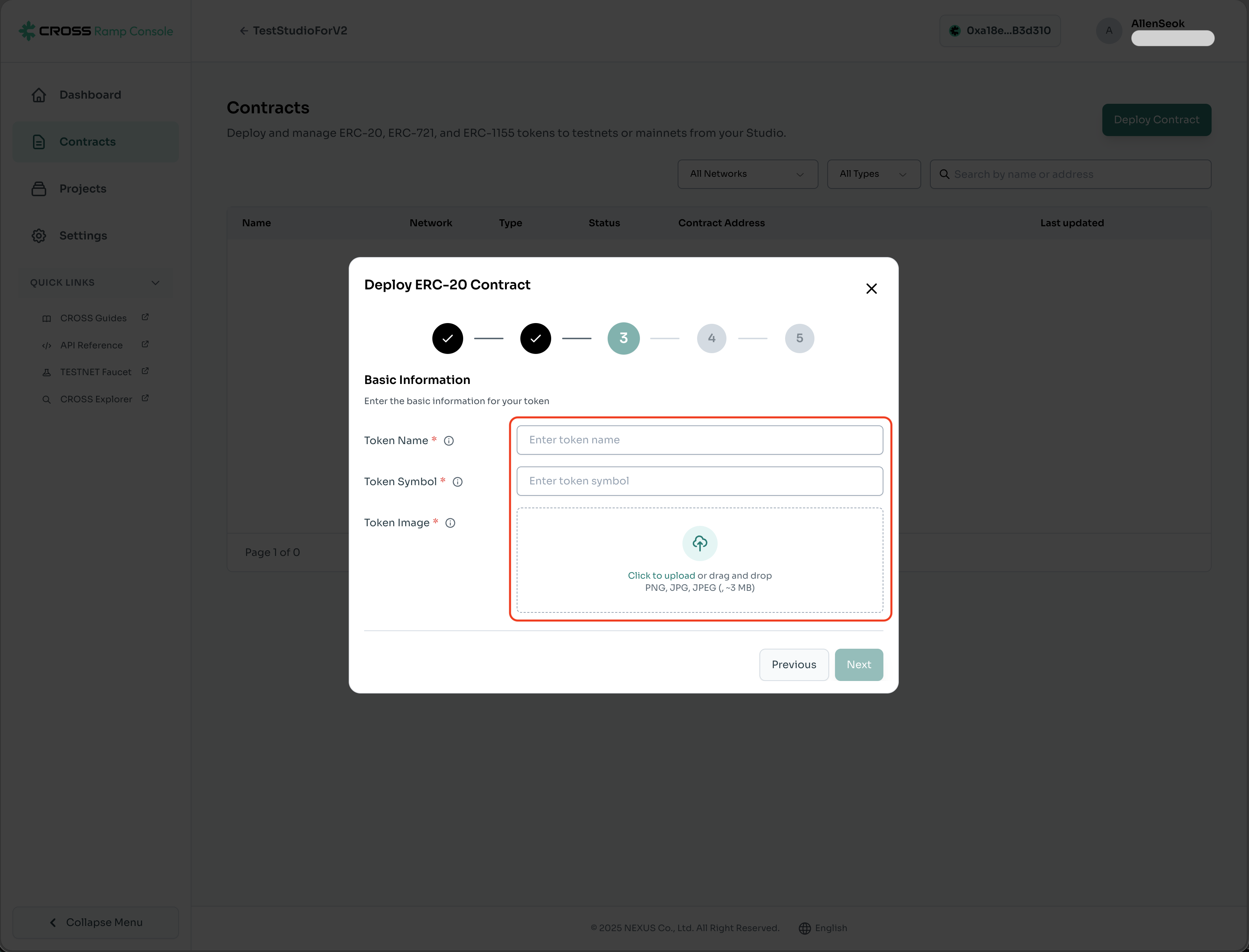 Guide on deploying and setting up FT and RAMP contracts, including network selection, token information, and project settings.