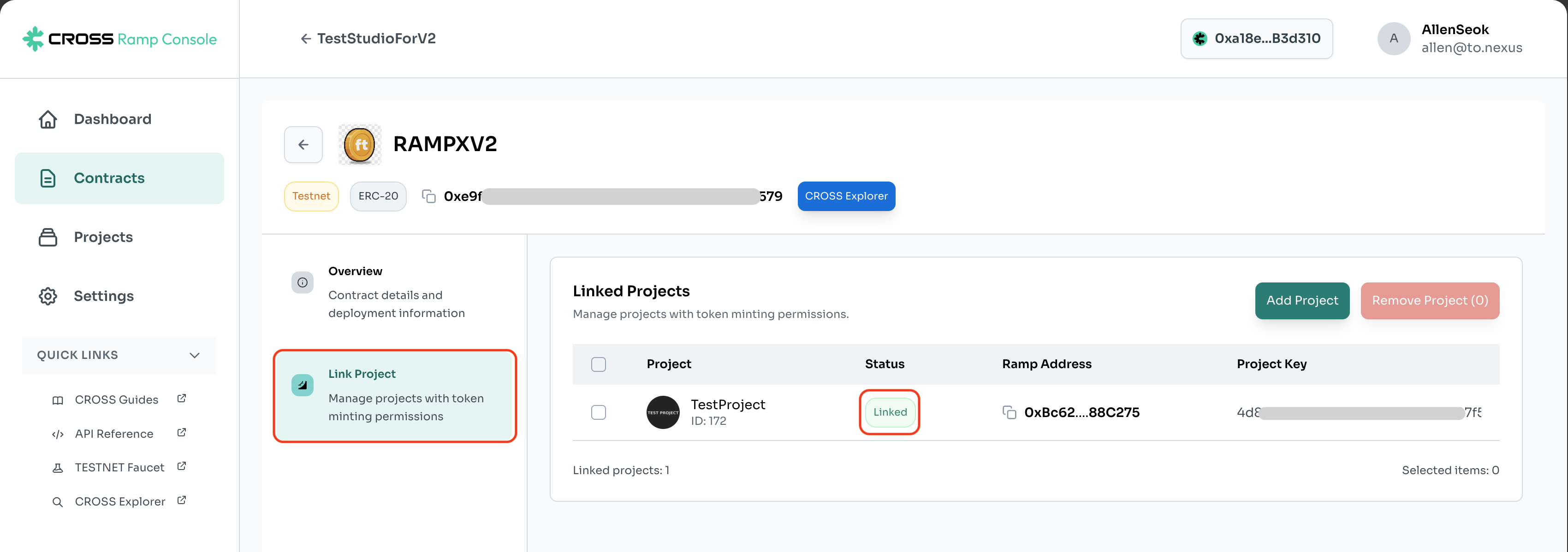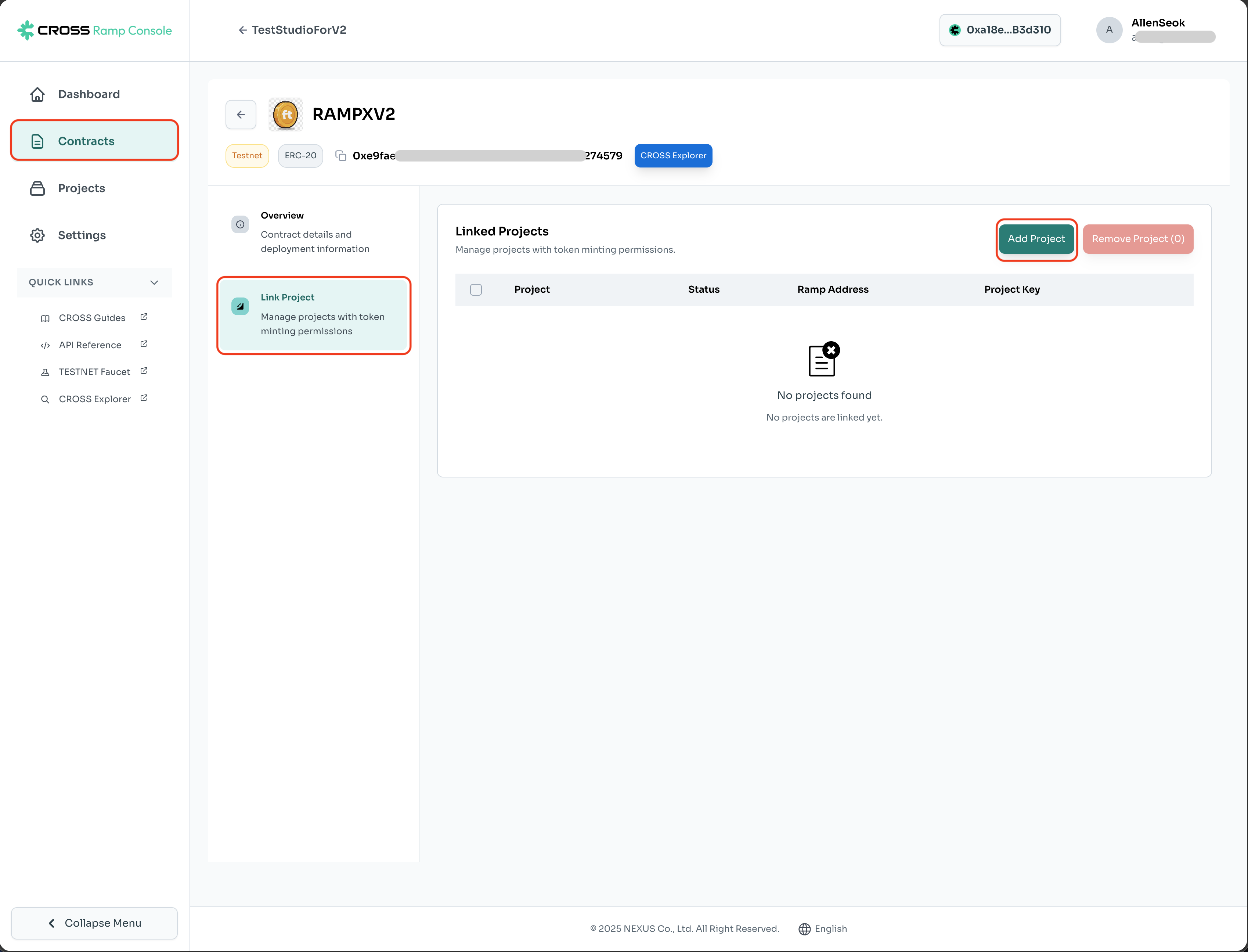 In project settings -> Contracts -> Link Project -> Add Project, linking between contracts (admin wallet signature) is required.